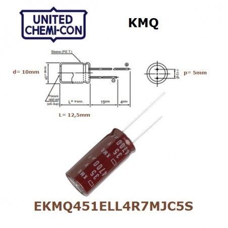 • United Chemi-Con KMQ 4,7uF 450V radial electrolytic capacitor EKMQ451ELL4R7MJC5S
