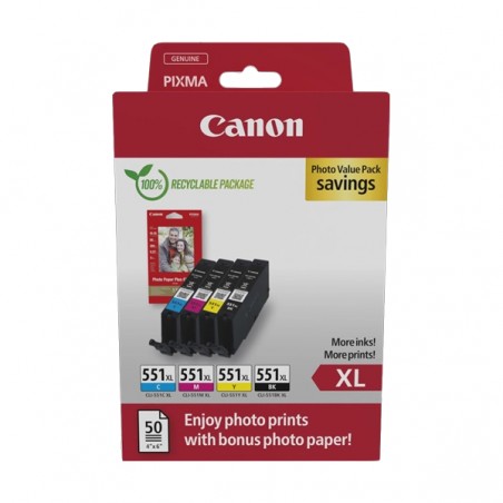 ORIGINAL Canon Value Pack nero / ciano / magenta / giallo CLI-551 XL + 10x15 cm Fotopapier 50 Blatt ~2800 Seiten