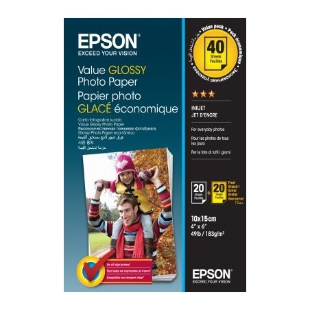 ORIGINAL Epson Carta Bianco C13S400044 Value Glossy Photo Papier Value Glossy carta fotografica, 10 x 15 cm, 183g/m², 2 x 20 fogli, brillante