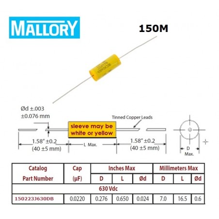• Mallory '150', 0,022uF/630V 5% condensatore poliestere assiale 150223J630DB