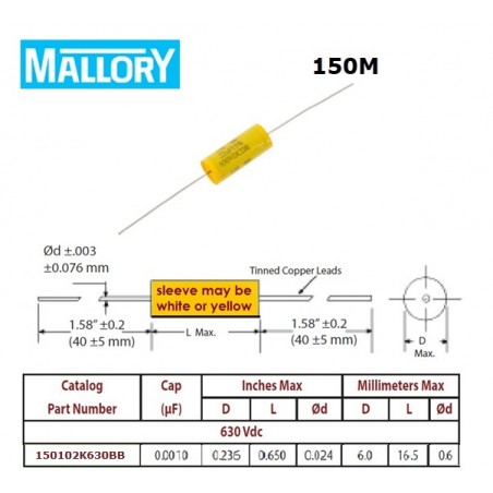 • Mallory '150', 0,001uF/630V 10% condensatore poliestere assiale 150102K630BB